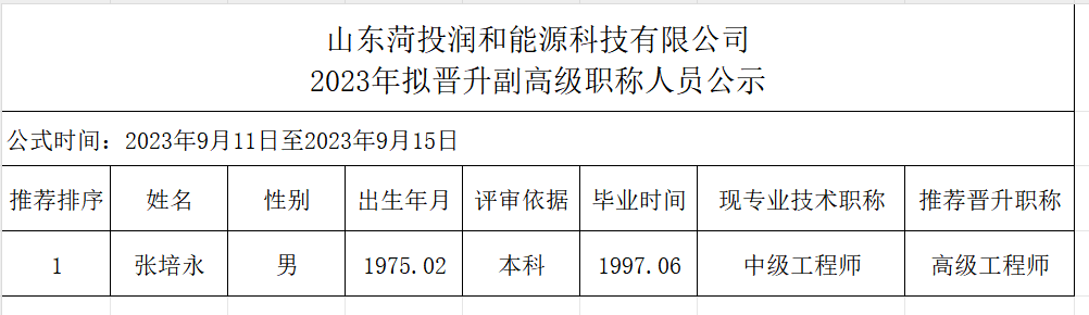 山東菏投潤和能源科技有限公司2023年擬晉升副高級(jí)職稱人員公示
